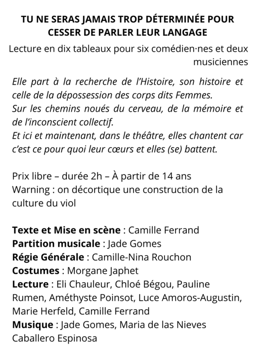 On est l'équipe de la Navire Collective, on vous invite à venir voir la lecture d'une pièce, écrite par Camille Ferrand, qui s'intitule : "Tu ne seras jamais trop déterminé·e pour cesser de parler leur langage".